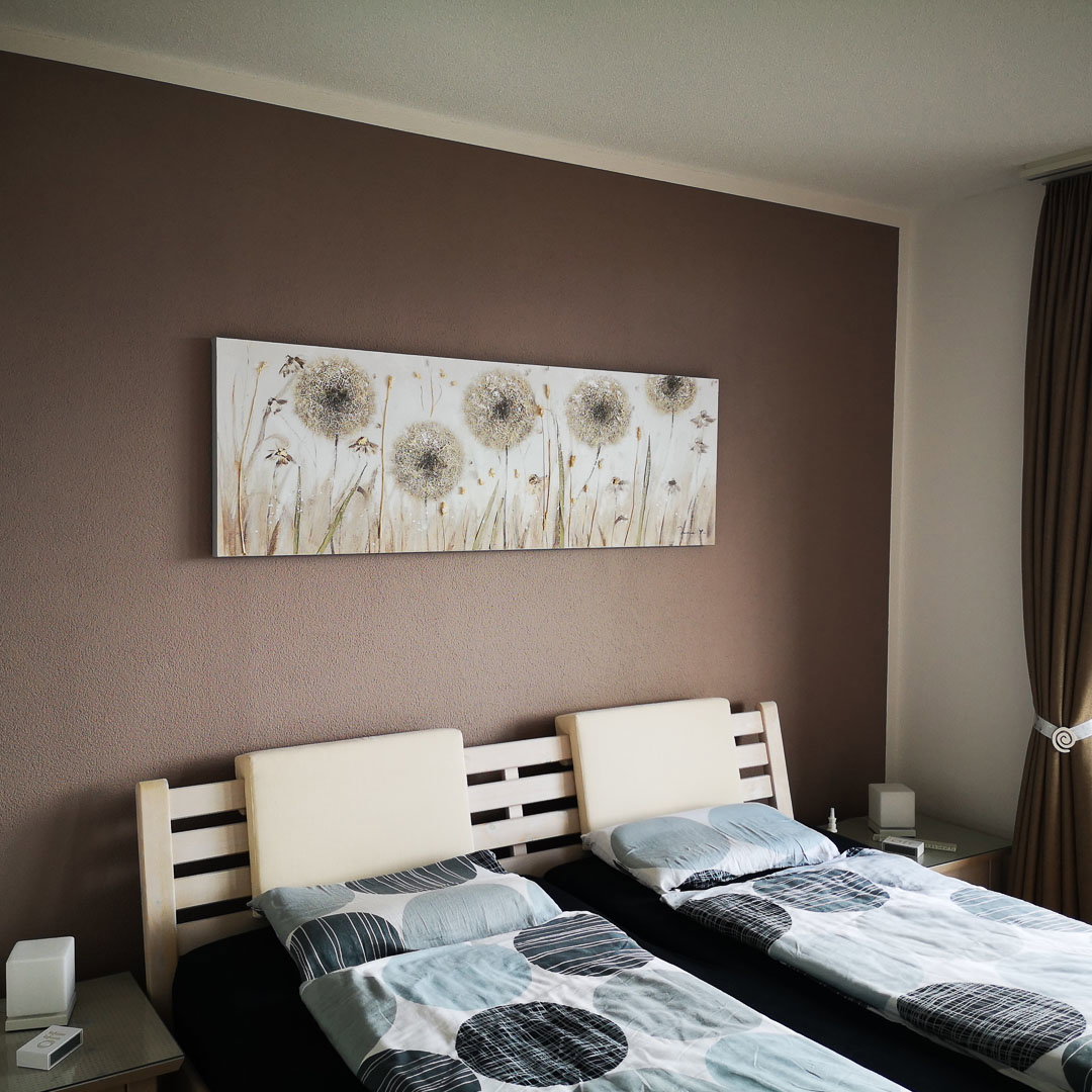 Auf dem stilvollen Acrylgemälde 'Dandelion Meadow' erscheint eine zarte Wiese mit Pusteblumen, die ihre beigen Samen dem Wind entgegenstrecken. Mit Feingefühl und raffinierter Pinselführung strahlt das gefühlvolle Bild mit Glitter eine beruhigende Stimmung aus. In Ihrem Esszimmer sorgt das Kunstwerk für ein entspanntes Ambiente. Ihr handgemaltes Gemälde erhalten Sie in der Größe 150x50cm. Anders als bei minderwertigen Drucken auf Leinwand können Sie auf unseren Unikaten jeden Pinselstrich fühlen. 0 Canvas pictures 1 Acrylgemälde Handmade Quality 2 2 0